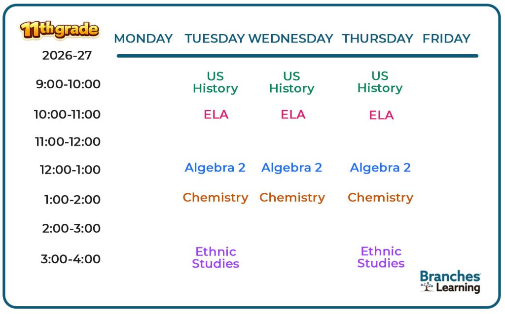 A weekly 11th grade schedule for 2026-27 with classes: US History, ELA, Algebra 2, Chemistry, and Ethnic Studies, color-coded by subject, Monday to Friday. Branches Learning logo is at the bottom right.