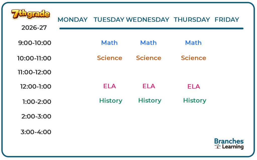 A 7th grade weekly schedule for 2026-27. Monday, Wednesday, and Friday have Math at 9, Science at 10, and ELA at 12. Tuesday and Thursday have the same subjects at the same times. History is at 1 PM daily. Branches Learning logo.